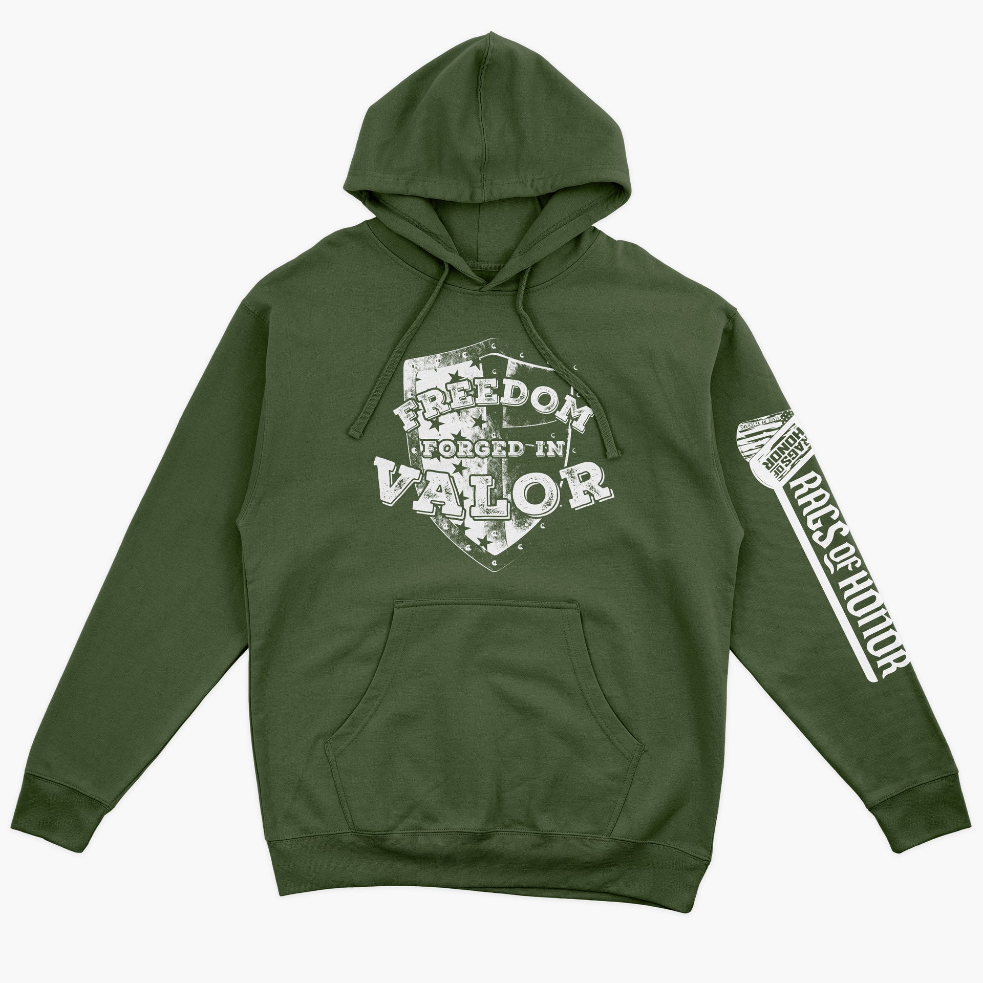 The Freedom Forged in Valor hoodie isn’t just a layer—it’s a bold statement of gratitude and pride. Perfect for chilly days, it pays tribute to the courage of those who serve.